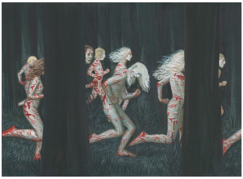 Esta é uma pintura da artista polonesa Aleksandra Waliszewska, conhecida por suas obras surreais, sanguentas e satânicas, que frequentemente exploram temas de opressão. A pintura mostra um grupo de jovens brancos, que foram brutamente chicoteados, correndo nus em pânico pela floresta para fugir de seus agressores que os estava caçando.