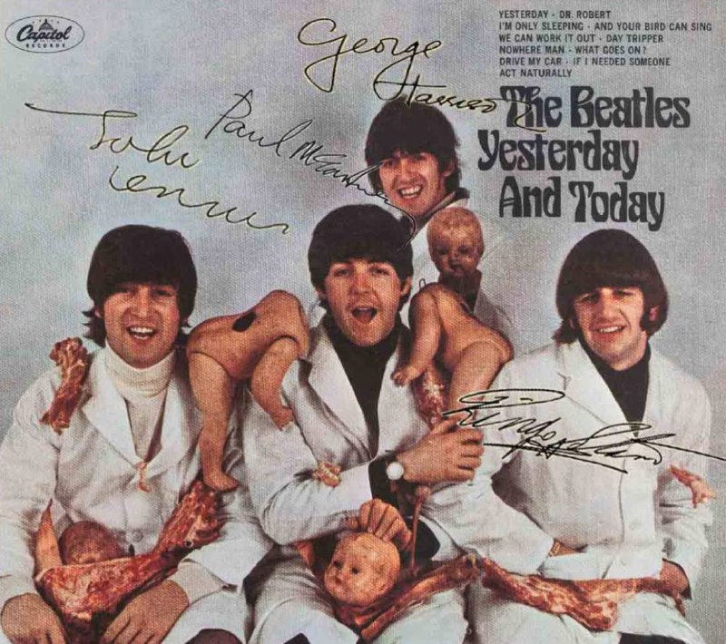 Nessa capa satânica dos Beatles, os integrantes da banda estão usando casacos brancos de açougueiros e estão cercados por bonecas despedaçadas, representando bebês, e pedaços de carne. Da mesma forma que a banda Alice Cooper, os Beatles estão dizendo de forma velada que sacrificaram crianças aos demônios em troca de fama e fortuna.