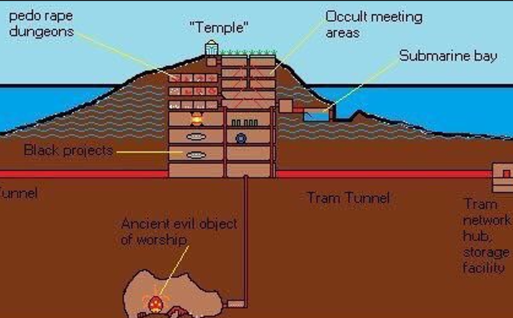 A Cabala construiu várias Bases Militares Subterrâneas Profundas (DUMBs) que estão conectadas por túneis a várias cidades subterrâneas nos EUA e outros países. Alguns DUMBs abrigam instalações de clonagem humana. Um submundo complexo com instalações projetadas para seus propósitos malignos, ligadas ao tráfico de mulheres e crianças. Uma dessas entradas era na Ilha Epstein, onde eles usavam seus Projetos MKULTRAs e chantageavam com gravações de suas torturas, estupros e assassinatos.