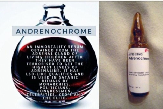 Adrenocromo é uma substância feita de adrenalina concentrada no sangue, retirado principalmente de crianças, que foram abusadas, aterrorizadas e que estavam com medo de morrer. A extração e consumo do sangue com Adrenocromo é feita em rituais satânicos depois que a criança é morta.