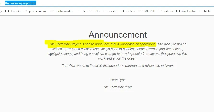 No domingo, 14 de julho de 2019, uma versão arquivada do site foi colocada online. O Projeto TerraMar foi a fachada perfeita para Maxwell e Epstein traficarem crianças para as elites pedófilas fingindo preocupação com o meio ambiente.