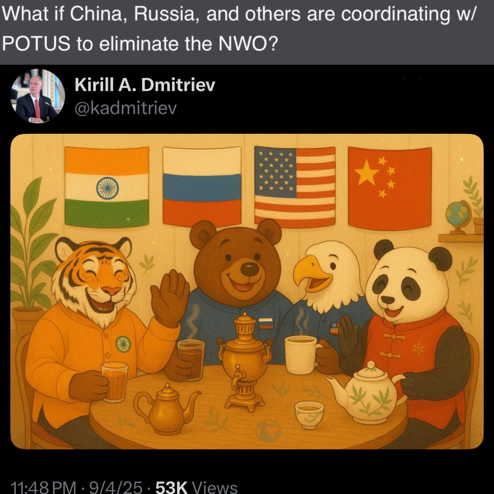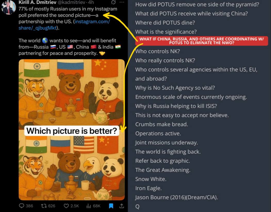 O assessor de Putin, Dmtriev, solta uma bomba ainda maior que a anterior. Depois de escrever que a Rússia e os Estados Unidos fazem parte da inteligência militar Q, ele pega um drop Q que diz que Rússia, Estados Unidos, India e China são aliados contra a Nova Ordem Mundial e coloca uma charge abaixo com os animais representando os três países: um urso para a Rússia, uma águia para os Estados Unidos, um panda para a China e um tigre para a Índia. Putin está falando e afirmando claramente que existe uma aliança entre esses países que descarrilou o plano de governança global.