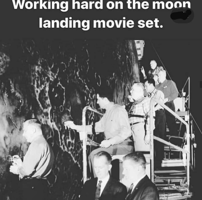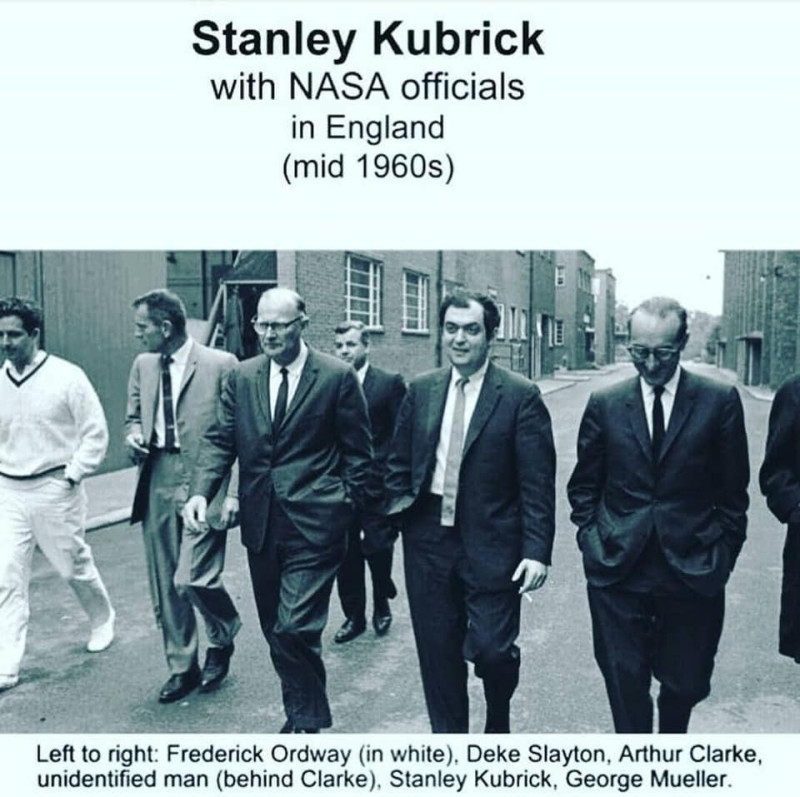 Por exemplo, uma fotografia da década de 1960, tirada na Inglaterra, retrata o renomado diretor de Hollywood Stanley Kubrick, que filmou a “missão lunar da NASA”, juntamente com funcionários dessa organização maçônica que enganou o mundo. Nela, vemos representantes da NASA como Frederick Ordway, Deke Slayton, George Muller e, entre eles, o renomado escritor de ficção científica Arthur C. Clarke. A legenda da foto diz: “Da esquerda para a direita: Frederick Ordway (de branco), Deke Slayton, Arthur C. Clarke, homem não identificado (atrás de Clarke), Stanley Kubrick, George Muller.”