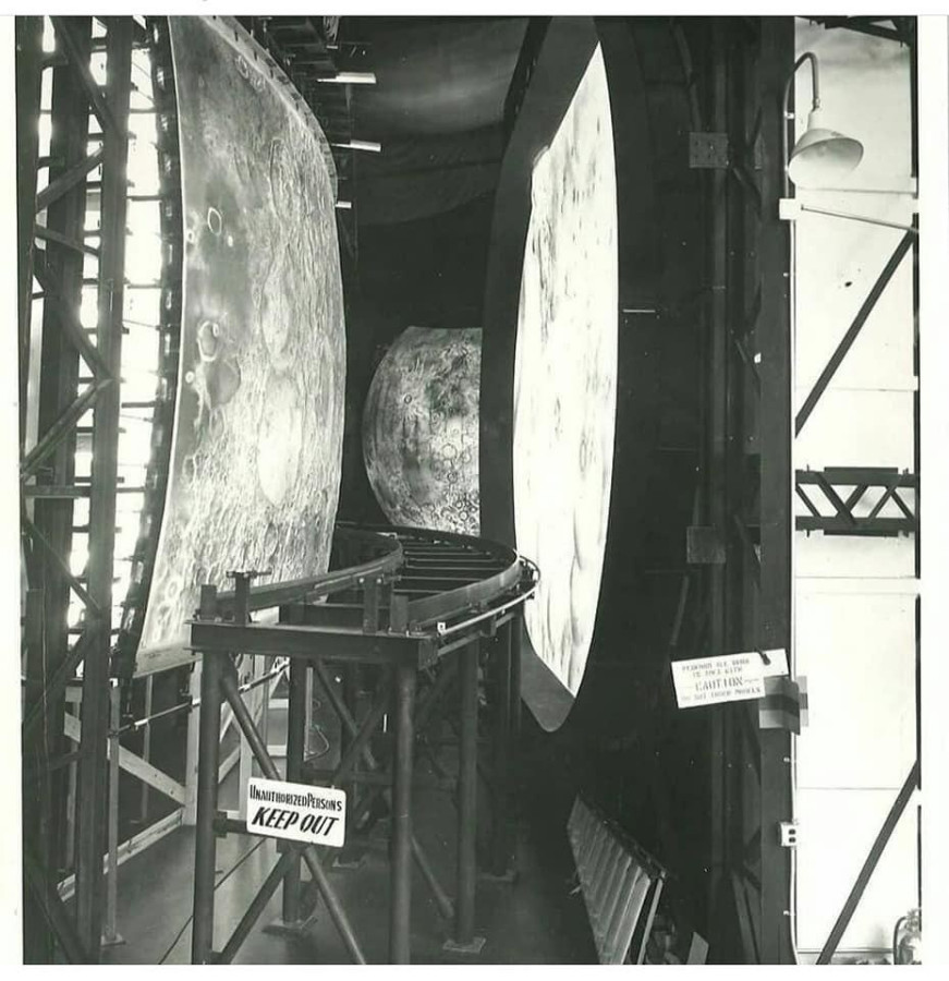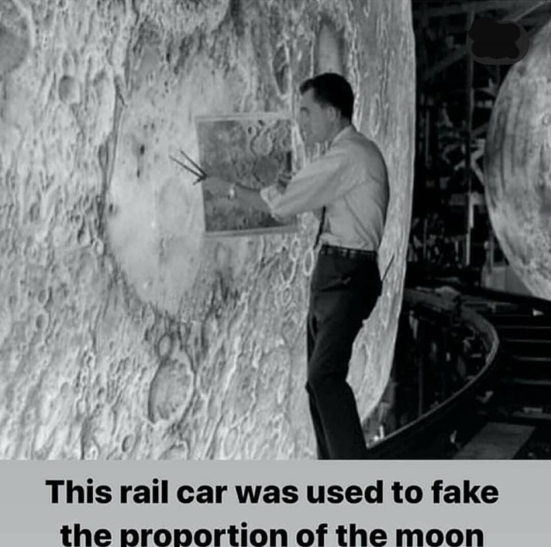 Aqui está a preparação de um “adereço” no estúdio “lunar” de Stanley Kubrick — uma maquete da “superfície lunar” usada para simular as filmagens durante as imaginárias missões Apollo. E é preciso dizer que a precisão da recriação da superfície lunar era bastante alta. A legenda da foto afirma que essa ferrovia foi usada para enganar as pessoas com essa maquete de um fragmento da superfície lunar.