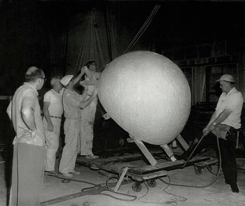 Esta foto mostra a equipe técnica trabalhando com “adereços espaciais” criados para simular o “voo de astronautas à Lua”.
