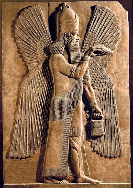 Os Anunnaki, deuses da Mesopotâmia, são frequentemente associados a representações com asas em selos cilíndricos e baixos-relevos, simbolizando sua natureza celestial, poder divino e capacidade de voar. Essas figuras aladas com barbas eram representações dos pilotos taygeteanos, que voavam em suas naves. A bolsa que as figuras seguram numa das mãos representam sementes para agricultura e a pinha na outra mão significa o conhecimento que os “deuses” deram aos humanos.