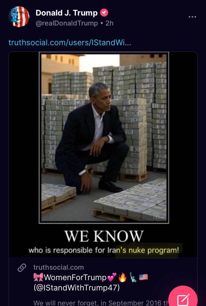 Obama financiou deliberadamente TODO o programa nuclear do Irã, terrorismo e enriquecimento pessoal para as elites corruptas, com bilhões de dólares em pallets de dinheiro vivo que ele entregou ao governo iraniano sob o disfarce de uma troca de reféns, ligada ao Acordo de 2015. Isso fazia parte de um plano globalista para provocar um holocausto nuclear. Olha a mensagem que Trump postou no Truth Social sobre quem foi o responsável por financiar o Irã:
