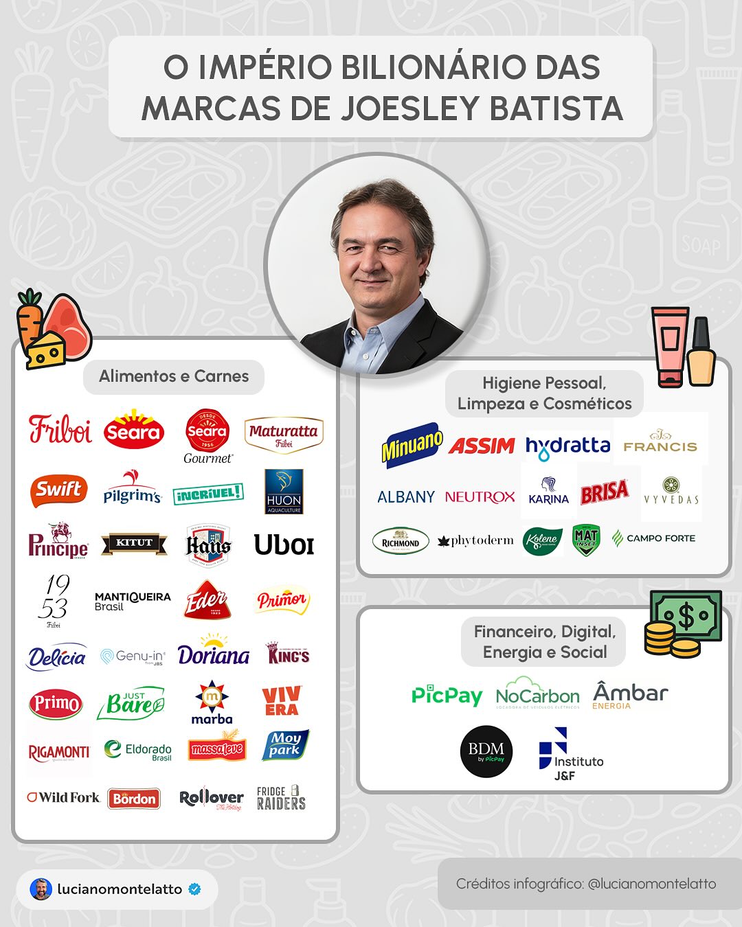 Você sabia que marcas como Friboi, Seara, PicPay, Neutrox e Minuano têm algo em comum? Todas pertencem ao império de Joesley Batista! Veja as 54 marcas que compõem o vasto ecossistema da J&F Investimentos, grupo controlado pela família Batista, fundadora da JBS, a maior processadora de carnes do mundo. Com uma receita anual aproximada a R$ 400 bilhões, a J&F é um dos maiores conglomerados empresariais do mundo, presente no cotidiano de milhões de pessoas.