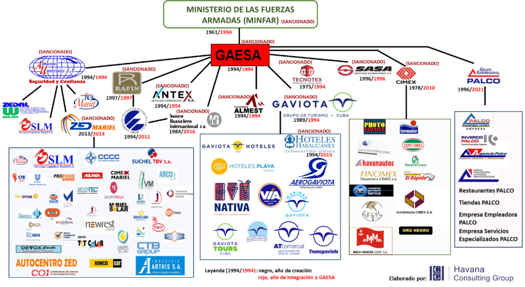Cubanos comuns enfrentam pobreza extrema, escassez e emigração em massa, enquanto a GAESA investe em hotéis de luxo e lava fundos ilícitos em paraísos fiscais do Reino Unido e Holanda no Caribe. A GAESA é uma corporação administrada pela elite cubana do poder, e está registrada como entidade estrangeira em outros países, fatura bilhões de dólares, explora instituições estatais cubanas, nega ao povo cubano recursos vitais para atender às necessidades básicas e não pode ser auditada pelo governo cubano.