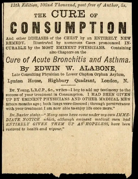 O termo “consumação” era usado principalmente nos séculos XVIII e XIX para se referir à tuberculose, e não é mais utilizado. O fato de ela usar essa palavra estranha e completamente antiquada sugere que ela não é uma humana normal. Em vez disso, ela é um receptáculo para uma antiga força sobrenatural. Anúncio de um livro de medicina do século XIX intitulado “A Cura da Consumação”.