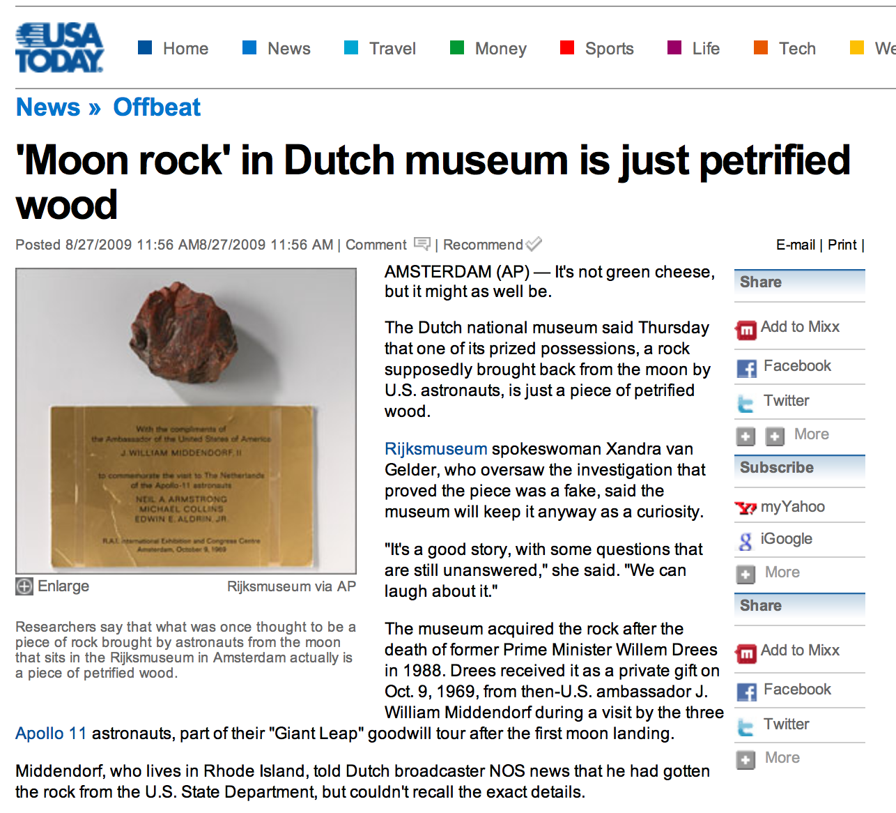 Outra rocha lunar ganhou as manchetes quando, 40 anos depois de ter sido entregue pessoalmente por Neil Armstrong e Buzz Aldrin ao primeiro-ministro holandês, foi examinada e comprovadamente é madeira petrificada. É verdade que algumas rochas lunares falsas não provam que todas as rochas lunares são falsas. Mas isso deveria ser motivo suficiente para iniciar um exame científico sistemático das dezenas de outras amostras que os EUA distribuíram cerimoniosamente em 1969 e na década de 1970.