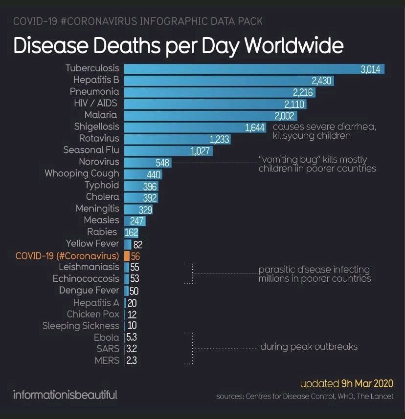 Também não é segredo que parte desse acordo comercial incluirá o acesso das grandes empresas farmacêuticas dos EUA ao Serviço Nacional de Saúde do Reino Unido e, muito provavelmente, um aumento de muitas vezes no preço dos medicamentos prescritos no Reino Unido para corresponder ao seu custo exorbitante nos EUA. Com o objetivo de trazer alguma perspectiva de volta ao alarmismo atual sobre o coronavírus, confira este gráfico das doenças que são as principais causas de mortes diárias ao redor do mundo e, se necessário, priorize a proteção contra a febre amarela antes de agir contra o coronavírus.