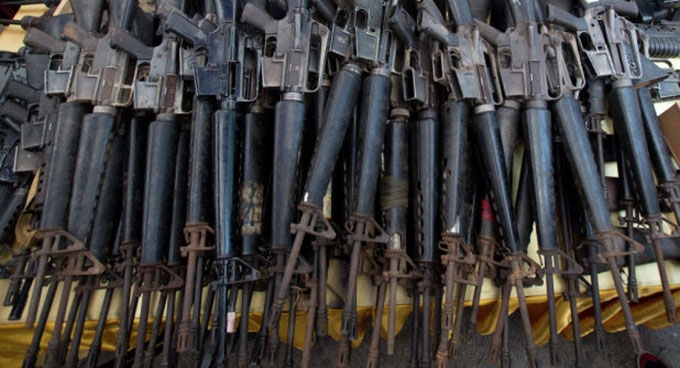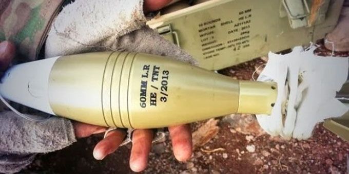 Armas e foguetes de fabricação israelense usados pelo ISIS e apreendidas em uma base do Estado Islâmico no Iraque.