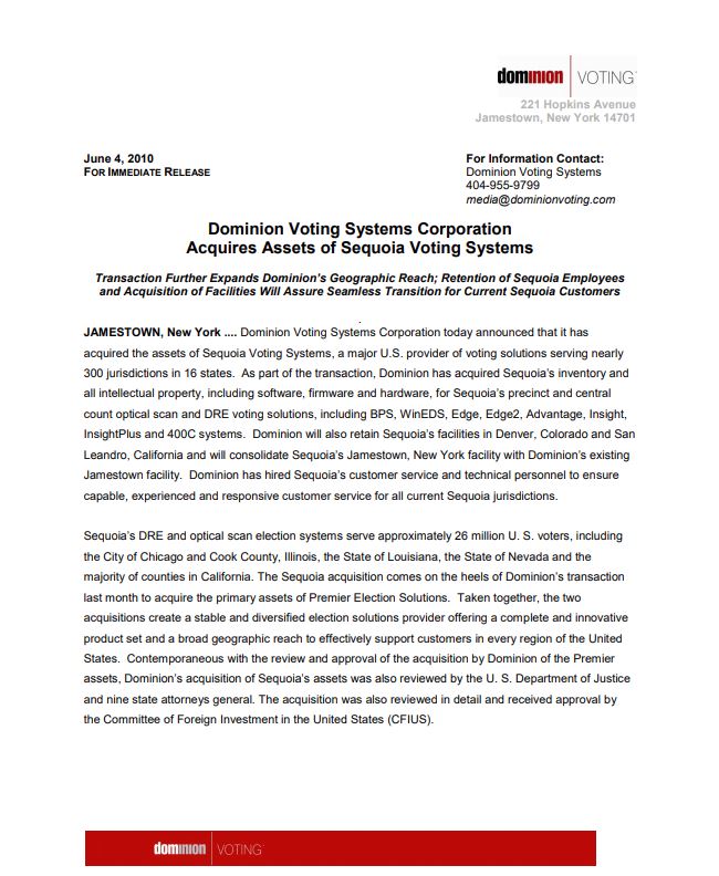 A Dominion Voting Systems apresentou um comunicado de imprensa anunciando a aquisição da propriedade intelectual, hardware e software que antes pertenciam à Smartmatic. O código-fonte eleitoral da Dominion era da Smartmatic. Um tempo depois, tanto a Dominion quanto a Smartmatic tentaram apagar seus vínculos excluindo o comunicado de imprensa original de seus sites. Obviamente, a Smartmatic está tentando desesperadamente remover seus vínculos com a Dominion.