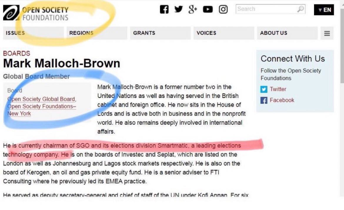 Malloch-Brown então se tornou presidente da Open Society, ocupando uma posição de destaque na rede de influência global de Soros, enquanto a Smartmatic continuou operando em sistemas eleitorais no mundo todo.