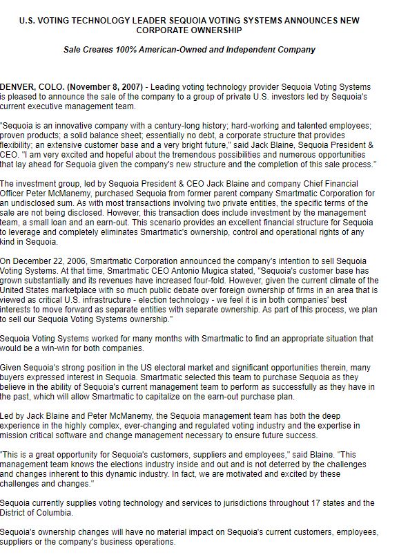 Em dezembro de 2007, a Smartmatic anunciou a venda de seus sistemas de votação Sequoia para a Dominion Voting Systems. A Smartmatic publicou um comunicado de imprensa anunciando a venda de seus sistemas de votação Sequoia, conforme mostrado na captura de tela abaixo.
