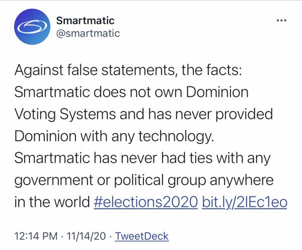 Porque a Smartmatic e a Dominion estão escondendo seus laços diretos? Porque estão apagando da internet artigos que ligam as duas empresas? Segundo o site thegatewaypundit em 14/11/20, a Smartmatic publicou um tweet negando a transferência de tecnologia para os sistemas de votação da Dominion. Mas isso é completamente falso.