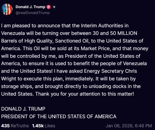 Tenho o prazer de anunciar que as Autoridades Interinas na Venezuela entregarão entre 30 e 50 MILHÕES de barris de petróleo de alta qualidade, sujeito a sanções, aos Estados Unidos da América. Este petróleo será vendido a preço de mercado, e esse dinheiro será controlado por mim, como Presidente dos Estados Unidos da América, para garantir que seja usado em benefício do povo da Venezuela e dos Estados Unidos! Solicitei ao Secretário de Energia, Chris Wright, que execute este plano imediatamente. O petróleo será transportado por navios-tanque e levado diretamente para os portos de descarga nos Estados Unidos. Agradeço a sua atenção a este assunto!