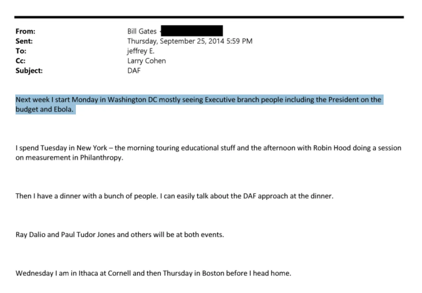 Na última semana de setembro de 2014, enquanto o mundo estava absorto nas notícias de que o Ebola estava se espalhando pela África Ocidental, Bill Gates enviou um e-mail surpreendentemente sincero para Jeffrey Epstein. Ele detalhou todo o seu itinerário para a semana seguinte: segunda-feira em Washington, D.C., “principalmente para me encontrar com pessoas do Poder Executivo, incluindo o Presidente, para tratar do orçamento e do Ebola”. Terça-feira em Nova York para eventos da Fundação Robin Hood e um jantar privado com Ray Dalio, Paul Tudor Jones e outros financistas da elite. Quarta-feira em Cornell, quinta-feira em Boston. O tom não era o de um conhecido casual. Era o de alguém prestando contas a um conselheiro de confiança. ( DOJ: EFTA02386397 )