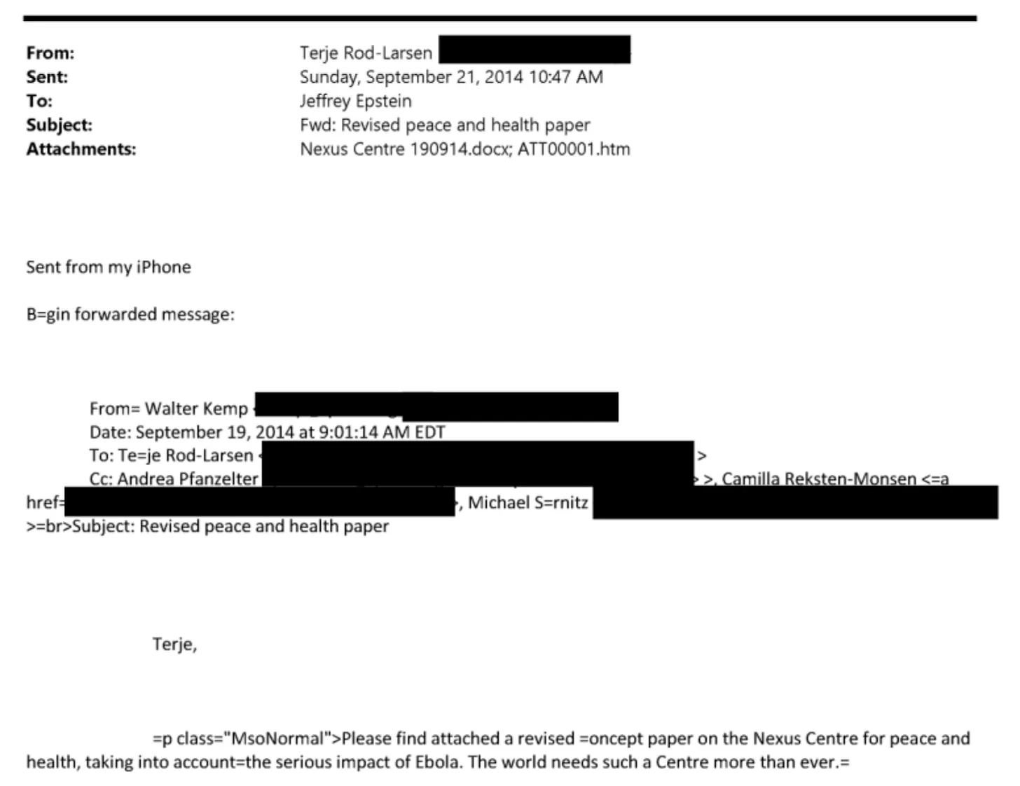 Em 21 de setembro — quatro dias antes de Gates enviar um e-mail a Epstein sobre sua reunião presidencial — um diplomata sênior da ONU encaminhou a Epstein um documento conceitual revisado para um “Centro de Conexão para a Paz e a Saúde”, explicitamente atualizado “levando em consideração o grave impacto do Ebola”. O remetente, Walter Kemp, escreveu: “O mundo precisa de um Centro como este mais do que nunca”. O destinatário que o encaminhou a Epstein foi Terje Rød-Larsen, então presidente do Instituto Internacional da Paz e ex-Subsecretário-Geral da ONU. ( DOJ: EFTA02683658 )