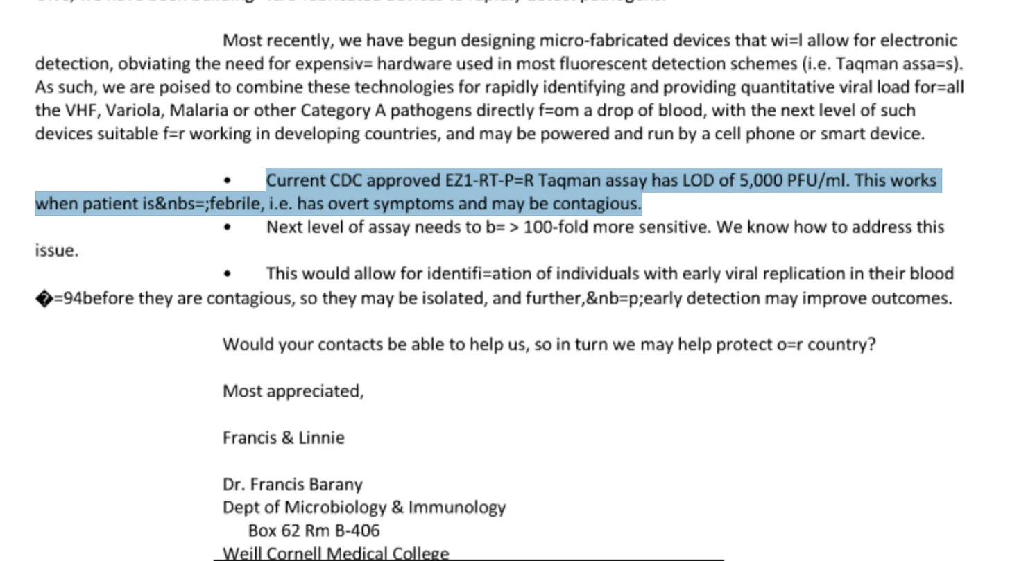 Em 8 de outubro de 2014 — dias após a securitização do Ebola — veio à tona uma troca de e-mails mostrando cientistas do Weill Cornell Medical College apresentando um sistema de detecção pré-sintomática do Ebola. A tecnologia utilizava PCR multiplex para identificar patógenos a partir de uma única gota de sangue antes que o paciente apresentasse sintomas ou se tornasse contagioso, com o objetivo de construir dispositivos microfabricados que pudessem ser alimentados por um telefone celular. ( DOJ: EFTA02592815 )
