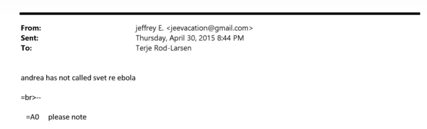 O ebola saiu das manchetes em meados de 2015. Mas a governança que ele justificava, não. Em 30 de abril de 2015, Epstein enviou dois e-mails. O primeiro, para um destinatário não divulgado, dizia simplesmente: “ipi ebola agora em setembro.” ( DOJ: EFTA02501915 ) O segundo, para Terje Rød-Larsen, do Instituto Internacional da Paz, relatava: “andrea não ligou para a svet sobre o ebola.” ( DOJ: EFTA02502119 )