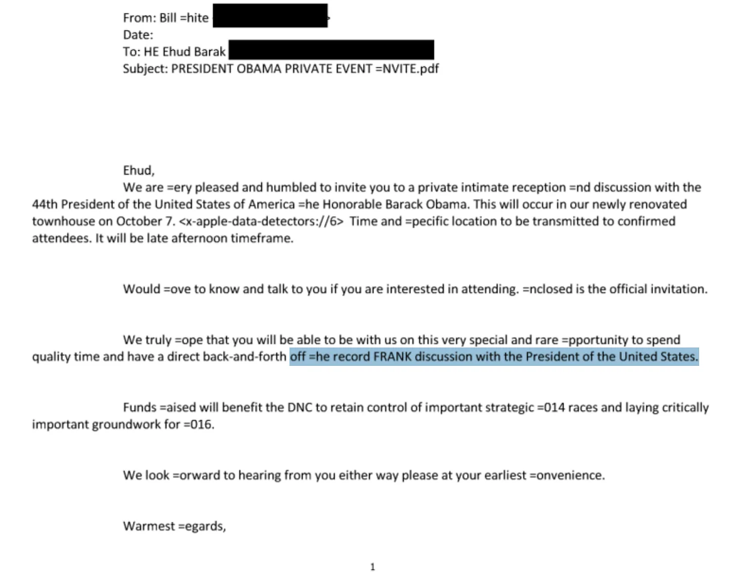 Três dias depois, em 28 de setembro, uma conexão separada com Obama veio à tona por meio do mesmo intermediário. Nili Priell Barak — assistente do ex-primeiro-ministro israelense Ehud Barak — encaminhou a Epstein um convite para uma recepção privada e confidencial com o presidente Obama, marcada para 7 de outubro em uma residência particular. O convite era explícito: “Uma conversa franca, direta e confidencial com o presidente dos Estados Unidos”. Os fundos arrecadados “beneficiariam o Comitê Nacional Democrata (DNC) para manter o controle de importantes eleições estratégicas de 2014 e estabelecer as bases cruciais para 2016”. ( DOJ: EFTA02713512 )