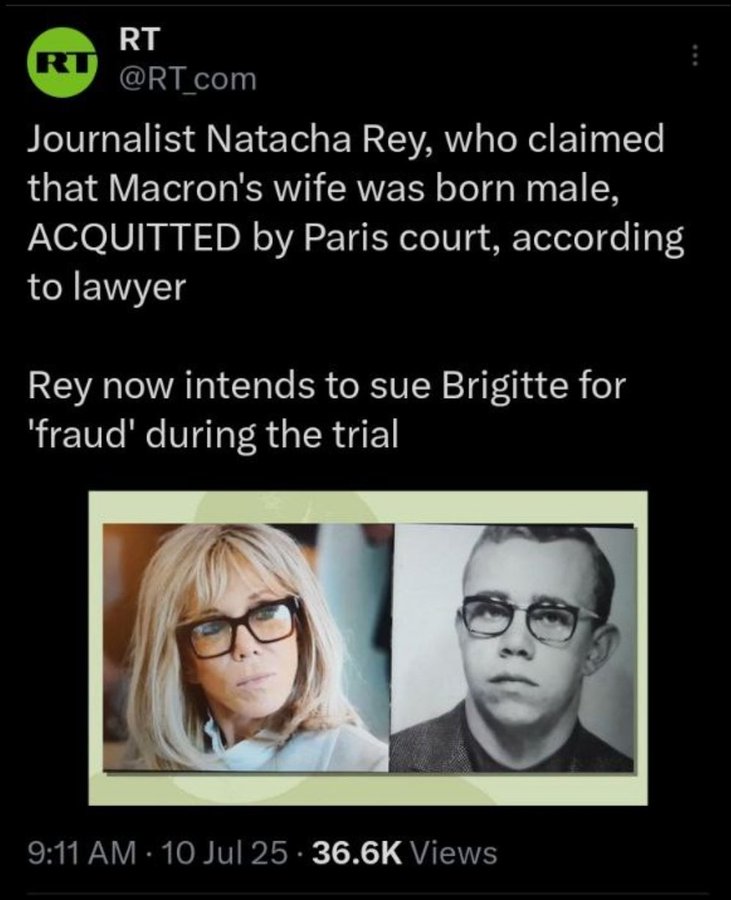 Um tribunal de Paris anulou em 10 de julho as condenações contra a médium Amandine Roy e jornalista Natacha Rey acusadas de difamação contra a primeira-dama francesa Brigitte Macron, depois de terem provado que ela era na verdade um homem. A absolvição de Natacha foi uma surpresa, visto que ela sempre foi injustamente perseguida pelo regime de Emmanuel Macron.