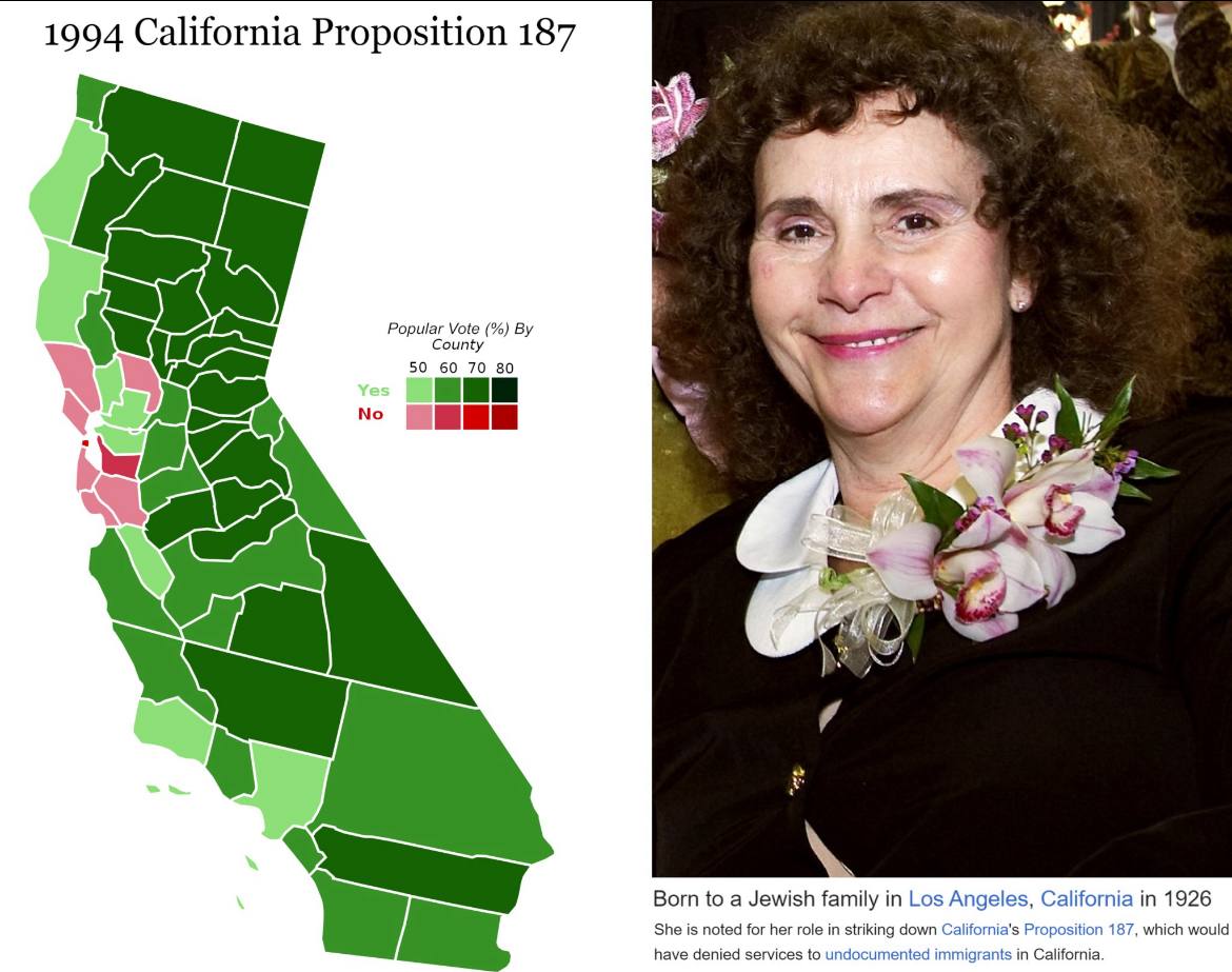 Em 1994, os eleitores da Califórnia aprovaram a Proposição 187, uma iniciativa criada para desencorajar a imigração ilegal e economizar dinheiro dos contribuintes, negando benefícios públicos a imigrantes ilegais. No entanto, a juíza judia Mariana Pfaelzer a derrubou. A Califórnia agora tem pelo menos 2,2 milhões de imigrantes ilegais.