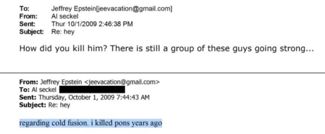 Pons e Fleischmann lançaram sua inovadora pesquisa sobre fusão a frio em 1989, que foi rapidamente encerrada. Sempre que inovações em energia são interrompidas de forma suspeita, alguém tem dinheiro a perder e garante que isso não aconteça. Pons mudou-se para a França depois que sua credibilidade foi manchada. No e-mail Epstein diz “sobre fusão a frio, matei Pons anos atrás”, mas Pons ainda está vivo. Então ele quis dizer que matou a pesquisa de Pons.