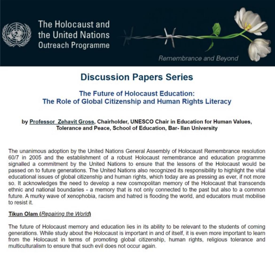 A adoção unânime pela Assembleia Geral das Nações Unidas da resolução 60/7 de Memória do Holocausto em 2005 e o estabelecimento de um robusto programa de divulgação e educação sobre o Holocausto sinalizaram um compromisso das Nações Unidas para garantir que as lições do Holocausto fossem transmitidas às gerações futuras. As Nações Unidas também reconheceram a sua responsabilidade em destacar as questões educacionais vitais da cidadania global e dos direitos humanos, que hoje são tão urgentes como sempre, se não mais. Reconhece a necessidade de desenvolver uma memória cosmopolita do Holocausto que transcenda fronteiras étnicas e nacionais – uma memória que não está apenas ligada ao passado, mas também a um futuro comum. Uma onda sombria de xenofobia, racismo e ódio está inundando o mundo, e os educadores devem mobilizar-se para resistir a ela.