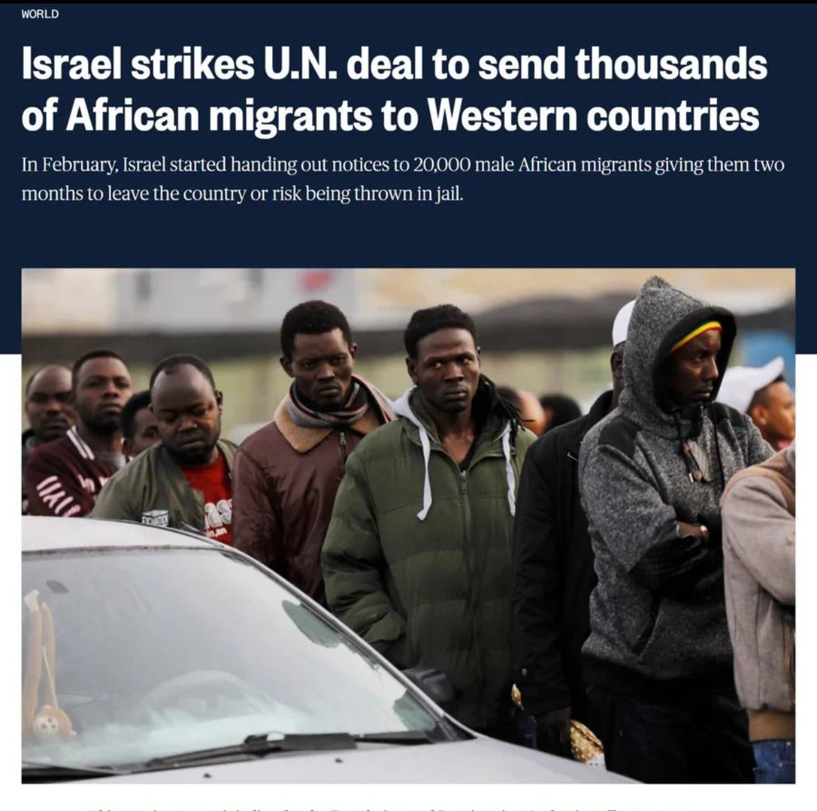 Apesar de possuir leis anti-imigração rigorosas, Israel pressiona outros países a aceitarem imigrantes e até mesmo realoca migrantes africanos de Israel para países europeus. Isso é o máximo da hipocrisia judaica.