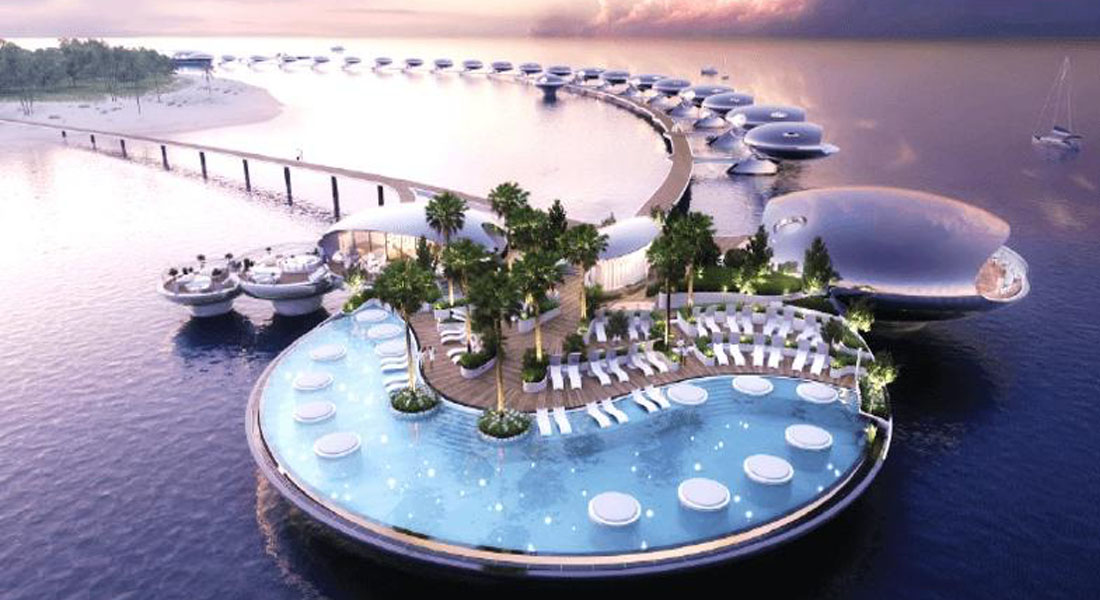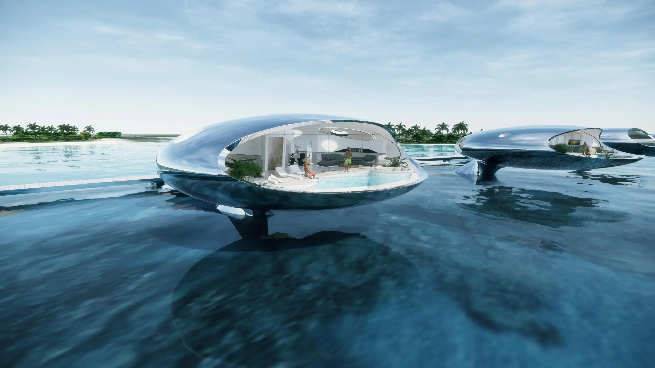 As villas assumem a forma de esferas de aço futuristas, flutuando acima da superfície da água, refletindo o mar, o céu e os recifes abaixo. Parecem mais naves espaciais.