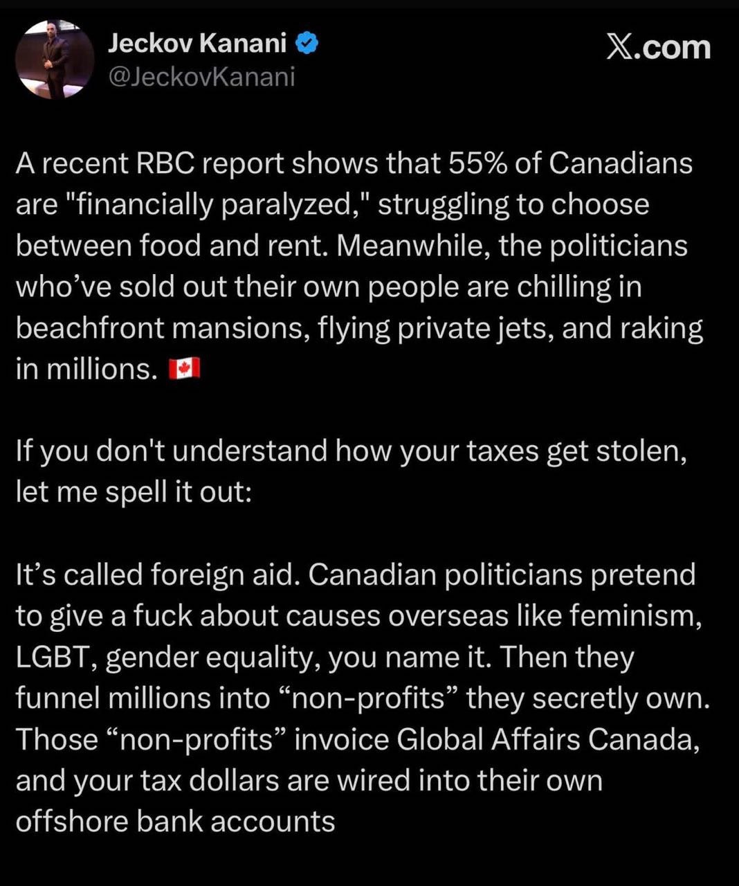 Um relatório recente do RBC mostra que 55% dos canadenses estão “financeiramente paralisados”, lutando para escolher entre comida e aluguel. Enquanto isso, os políticos que venderam seu próprio povo estão relaxando em mansões à beira-mar, voando em jatos particulares e faturando milhões. Se você não entende como seus impostos são roubados, deixe-me explicar: Chama-se ajuda externa.