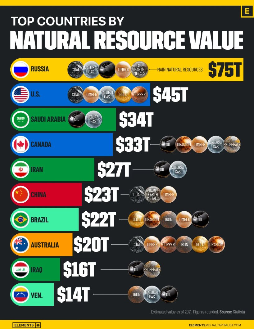 O sonho molhado dos aristocratas do Império Britânico, que estão por trás da UE, é o de invadir a Rússia para roubar seus vastos recursos naturais que valem mais de US$ 75 trilhões. A OTAN estava armando e treinando soldados ucranianos para invadir a Rússia e roubar seus recursos naturais para o Império Britânico. É disso que se trata todo o circo da guerra na Ucrânia. A lista abaixo mostra os 10 países mais ricos em recursos naturais e nenhum país europeu está nela.