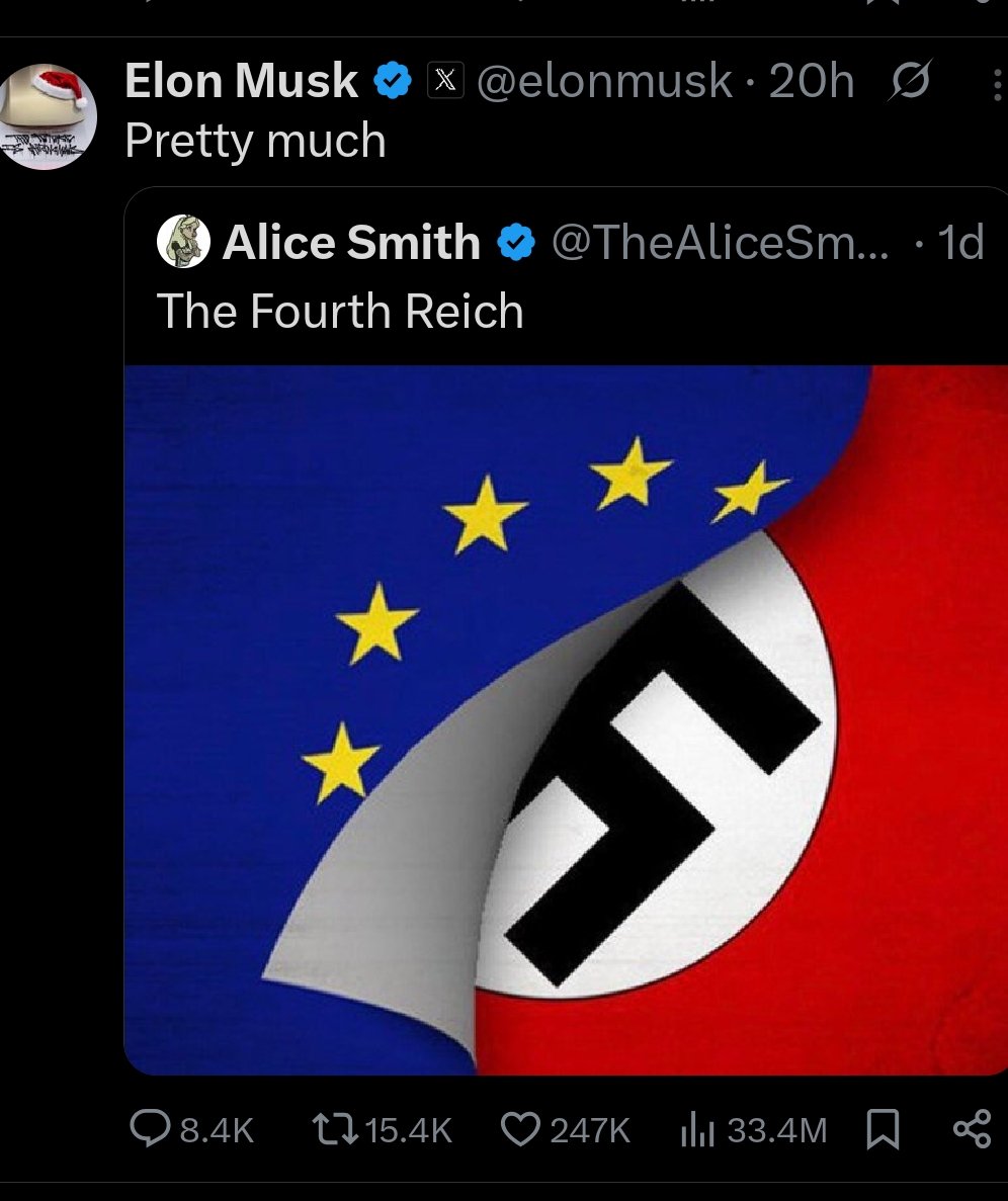 Elon Musk está pedindo a abolição da União Europeia: “A UE deve ser abolida e a soberania devolvida aos países individuais, para que os governos possam representar melhor seus povos”. Dissolver a UE é o objetivo do presidente Donald Trump, o mesmo acontece com a OTAN, ONU, Fórum Econômico Mundial, etc… todas entidades globalistas sem sentido que se tornaram irrelevantes.