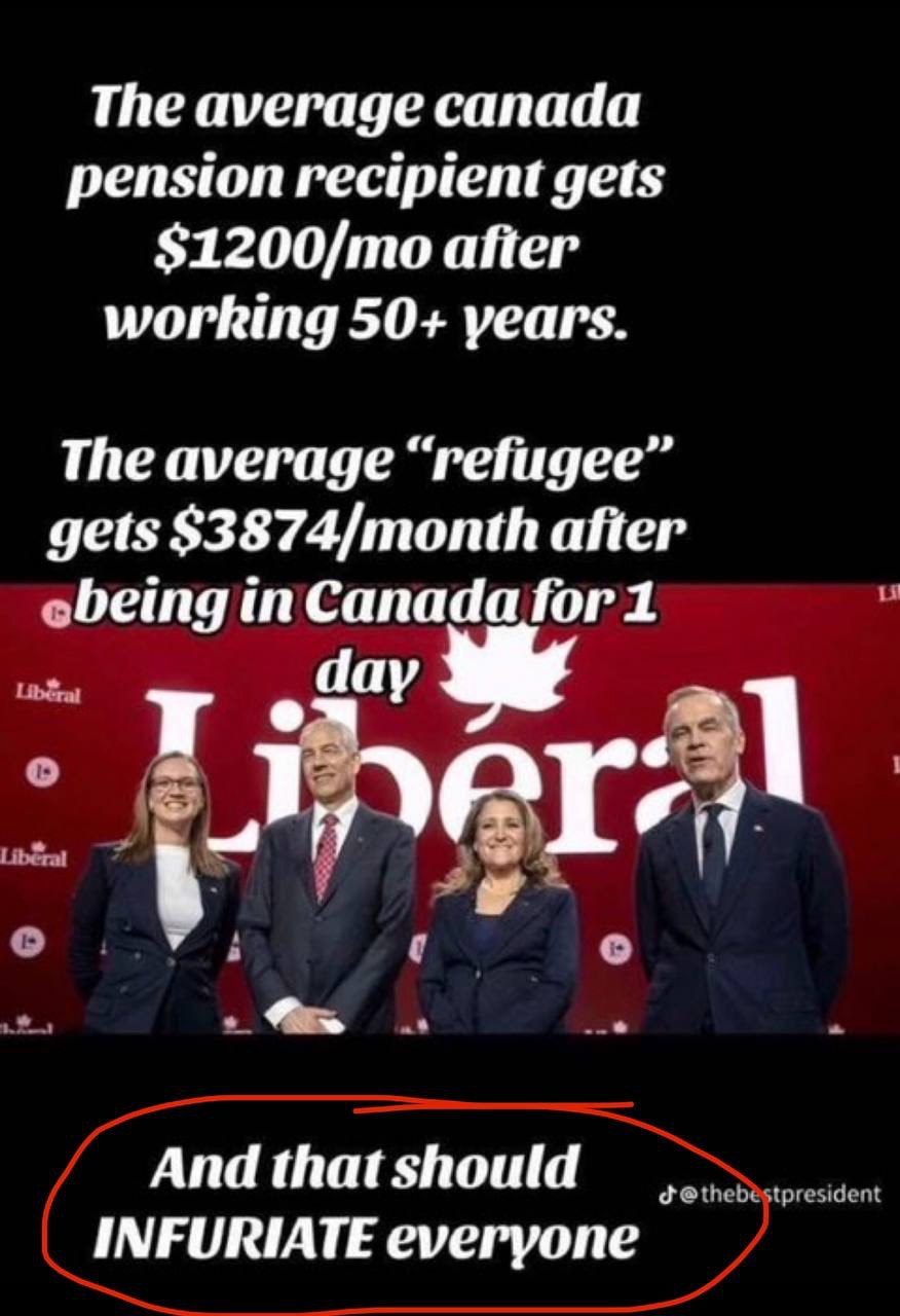 O beneficiário médio de pensão canadense recebe $1200/mês após trabalhar mais de 50 anos. O “refugiado” médio recebe $3874/mês após estar no Canadá por apenas 1 dia. E quem banca a boa vida dos “refugiados coitadinhos”? Os canadenses pagadores de impostos é claro, os mesmos que sustentam os políticos e burocratas vagabundos que recebem ordens do Fórum Econômico Mundial e Londres.