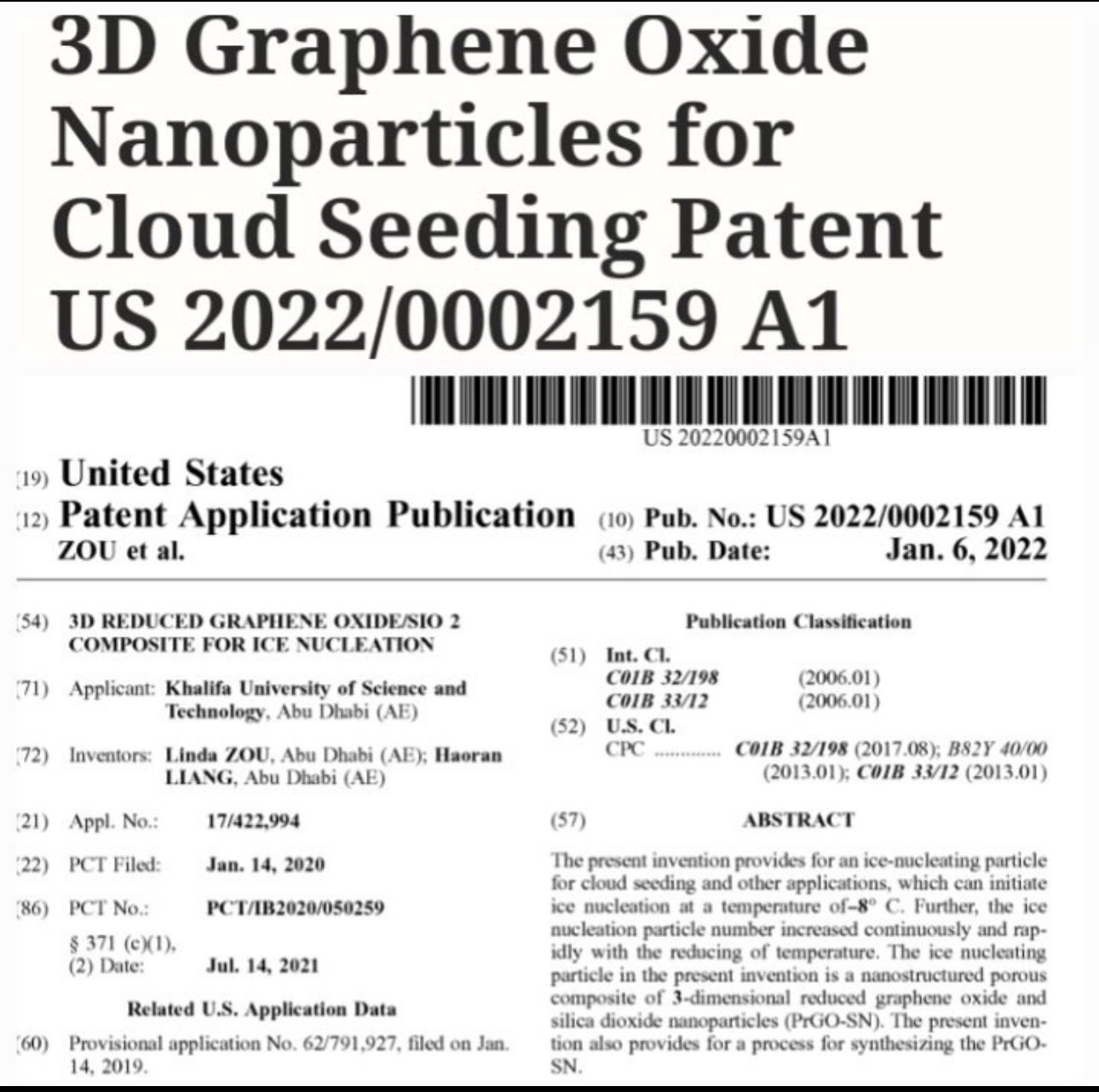 O documento é um pedido de patente dos EUA (US 2022/0002159 A1) para um compósito de óxido de grafeno reduzido em 3D e nanopartículas de dióxido de silício (PrGO-SN) para nucleação de gelo, especificamente para semeadura de nuvens. O óxido de grafeno é tóxico para a biologia mas está sendo introduzido nas vacinas “seguras e eficazes” e pulverizado nos céus. Onde estão as pro$tituta$ da mídia para denunciar isso?