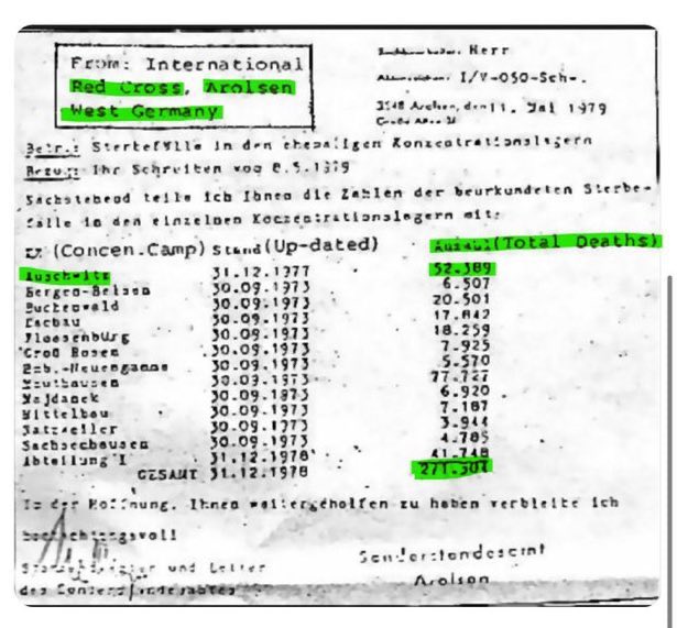 Um documento da Cruz Vermelha de 1979 estimou o total de mortes em TODOS os campos em 271.301. Os números do governo da Alemanha Oriental de 1983 estimam o total de mortes em TODOS os campos em 282.077. Não mais de 400.000 pessoas, que consistiam em homossexuais, comunistas, ciganos, assassinos, criminosos, pedófilos, presos políticos, prisioneiros de guerra, etc. e NÃO APENAS JUDEUS, morreram em TODOS os campos alemães. 6 milhões de judeus é pura ficção e os sionistas continuam empurrando essa MENTIRA.