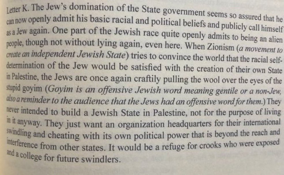 “Nem lhes passa pela cabeça construir um Estado judeu na Palestina para lá viverem; tudo o que querem é uma organização central para o seu golpe internacional, dotada de direitos soberanos próprios e imune à intervenção de outros Estados: um refúgio para canalhas condenados e uma universidade para futuros criminosos.”