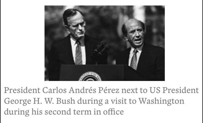 A Venezuela tem as maiores reservas de petróleo do mundo. Isso é FUNDAMENTAL. O que estava acontecendo no início dos anos 1970? Os EUA estavam abandonando o Padrão Ouro e estabelecendo o acordo “petrodólar” com a Arábia Saudita para controlar o suprimento mundial de petróleo e FORÇAR o mundo a comprar “dólares fiduciários”. A Venezuela teve que ser destruída. Como eles fizeram isso? George HW Bush instalou um presidente fantoche, Carlos Andrés Perez, numa eleição fraudulenta em 1974.