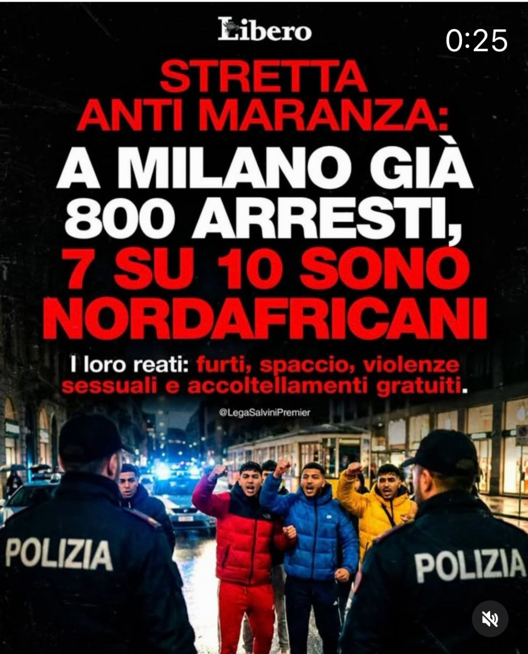 A imagem é um gráfico do jornal italiano Libero que relata uma operação de segurança pública em Milão chamada “Stretta Anti Maranza” (Operação Anti-Maranza). 800 pessoas já foram presas em Milão, sete em cada dez são norte-africanas. Seus crimes: roubo, tráfico de drogas, agressão sexual e esfaqueamentos gratuitos