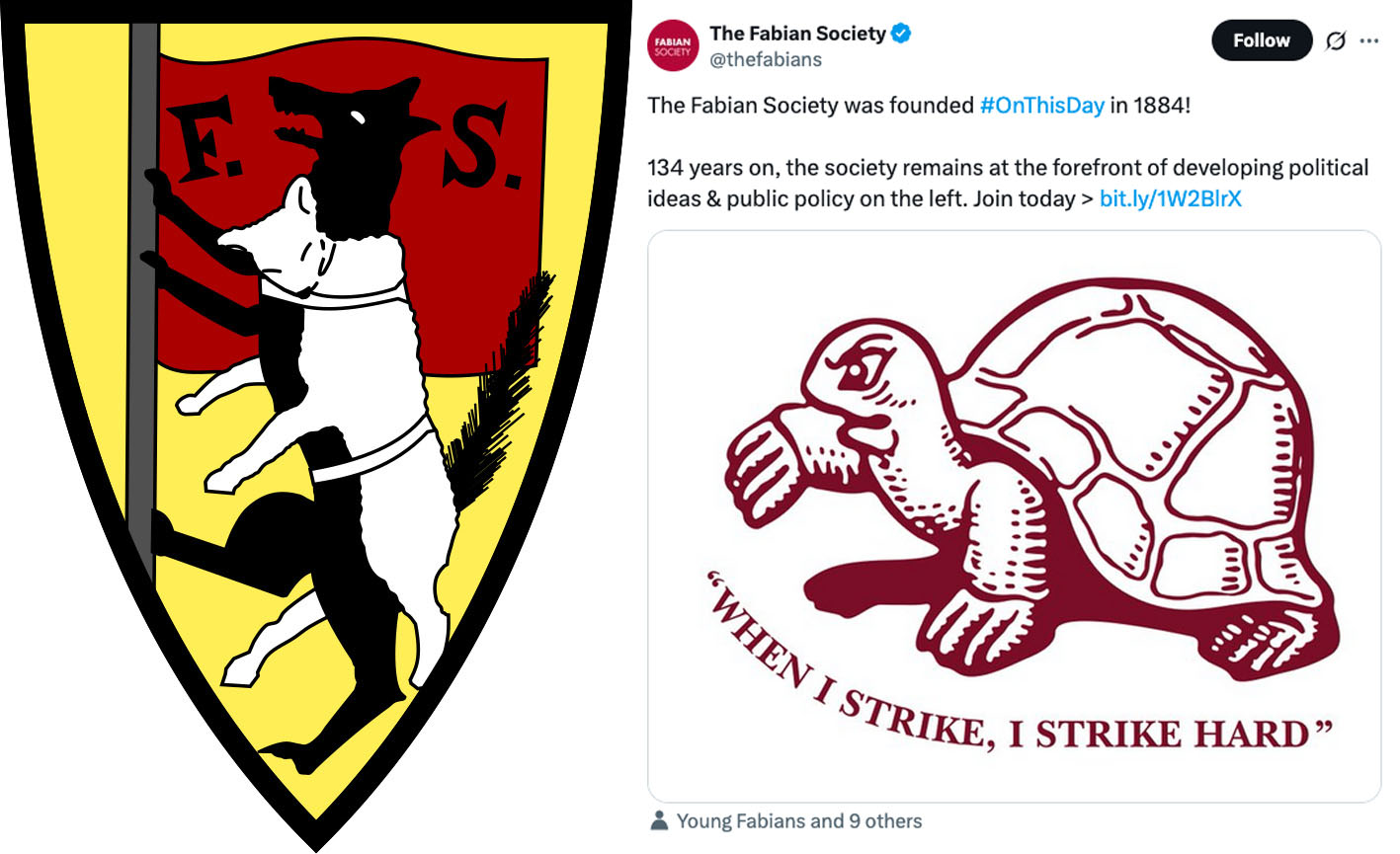 Da mesma forma, uma política de encobrir os objetivos da Sociedade ficou clara no primeiro brasão fabiano de um lobo em pele de cordeiro. Isso deu lugar ao logotipo atual do fabianismo internacional com uma tartaruga e as palavras: “Quando eu ataco, eu ataco com força”.