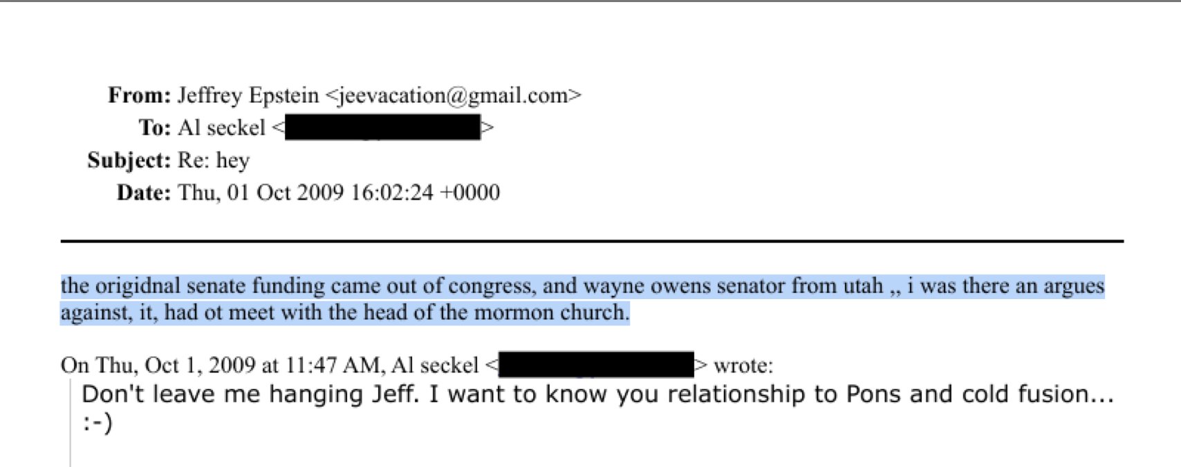 3- O fato de Epstein ter tido que se encontrar com o chefe da Igreja Mórmon, quase certamente porque o envolvimento institucional da BYU na disputa sobre a fusão a frio foi mediado pela governança da universidade pela Igreja mórmon.