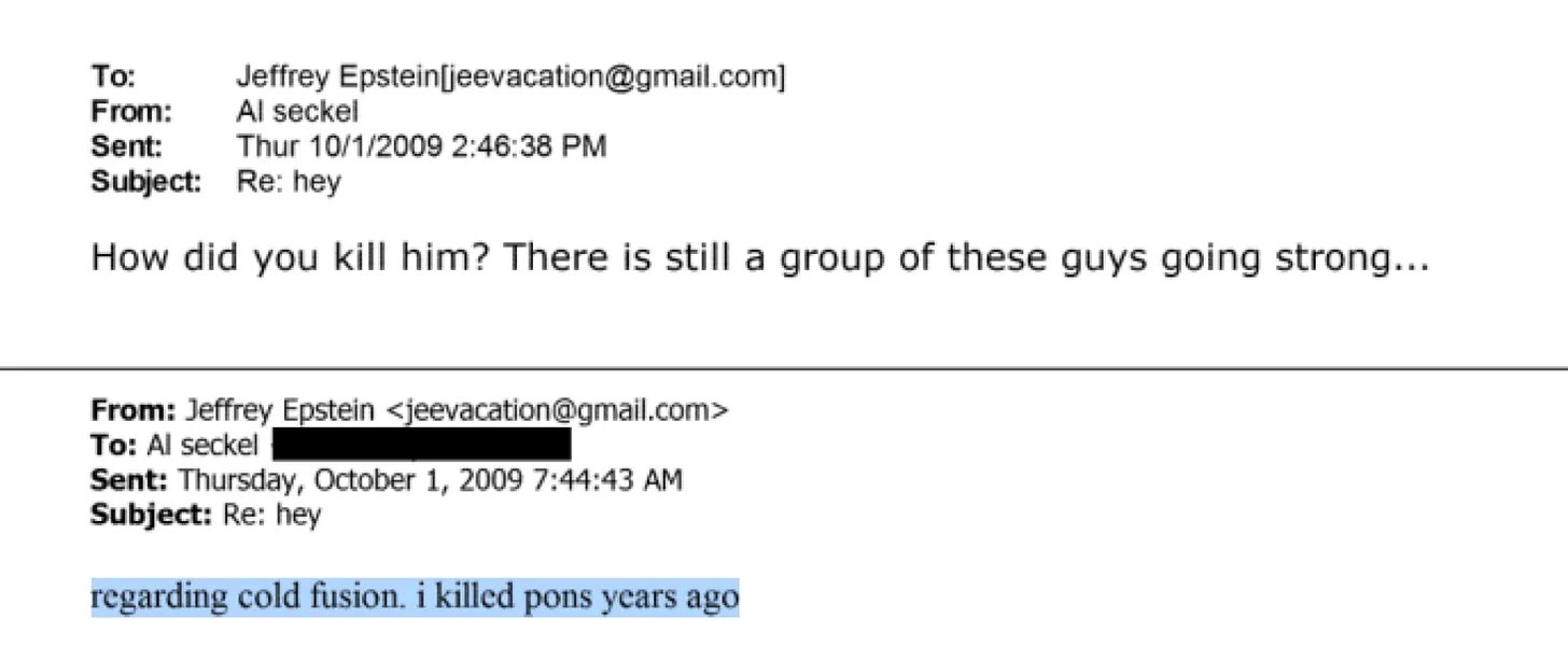 A troca de mensagens ocorreu aproximadamente um ano após Epstein ter se declarado culpado, em junho de 2008, por aliciar uma menor na Flórida e ter se registrado como agressor sexual. Na manhã de 1º de outubro de 2009, Epstein escreveu a Seckel: “Em relação à fusão a frio, eu matei Pons anos atrás.” Seckel respondeu no mesmo dia: “Como você o matou? Ainda existe um grupo desses caras firme e forte…”