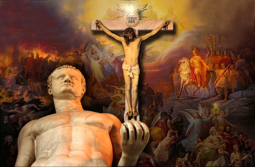 Conceito extra importante: Roma não caiu, apenas se transformou no Vaticano. O Papa é César. Isto sob o efeito do programa de deificação do Imperador de Roma, começando com Vespasiano, onde quando Nero caiu, ele ascendeu ao trono e se considerou “um deus vivo” e a adoração deste deus vivo foi imposta ao povo da Palestina e da Galileia (toda a área), onde por definição Tito se torna “o filho de Deus” apoiando ainda mais que Tito era Jesus (essa não é minha teoria, isso já está documentado por Flávio Josefo).