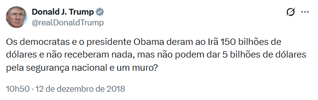 Trump publicou em seu canal no antigo Twitter: “Os democratas e o presidente Obama deram 150 bilhões de dólares (ao Irã) e não receberam nada em troca, mas não conseguem dar 5 bilhões de dólares para a segurança nacional e o muro?”