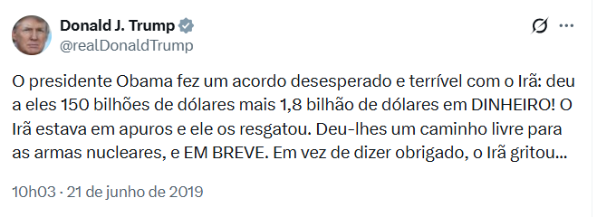 “O presidente Obama fez um acordo desesperado e terrível com o Irã – Deu a eles 150 bilhões de dólares mais 1,8 bilhão de dólares em DINHEIRO! O Irã estava em apuros e ele os resgatou. Deu-lhes um caminho livre para as armas nucleares e, EM BREVE”. Em vez de agradecer, o Irã gritou “Morte à América”. Terminei o acordo, que nem sequer foi ratificado pelo Congresso, e impus fortes sanções.”