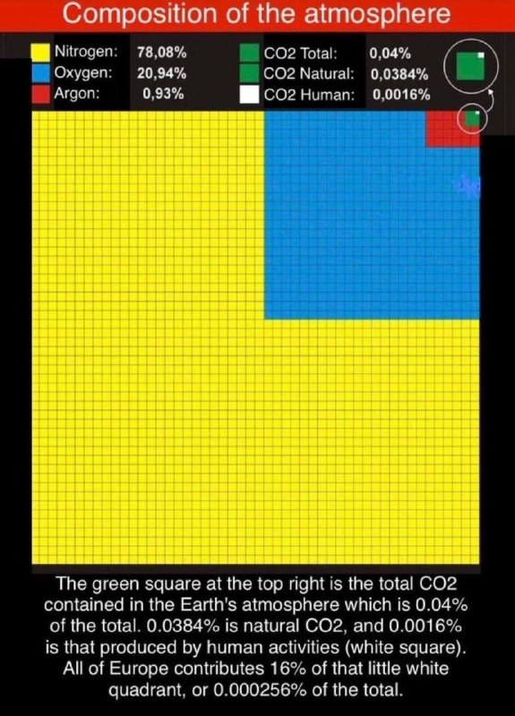 Este pequeno quadrado branco representa o CO2 produzido pelo homem: 0,0016% da atmosfera. Enquanto isso, eles nos taxam, nos ameaçam, nos condicionam e controlam todos os aspectos de nossas vidas com base em uma farsa alarmista sobre as “mudanças climáticas”. Emissões líquidas zero significam o fim da vida neste planeta. Mostre isso aos seus amigos idiotas alarmistas climáticos. Todo o envenenamento dos céus com Chemtrails se baseia nessa farsa ambientalista do CO2.