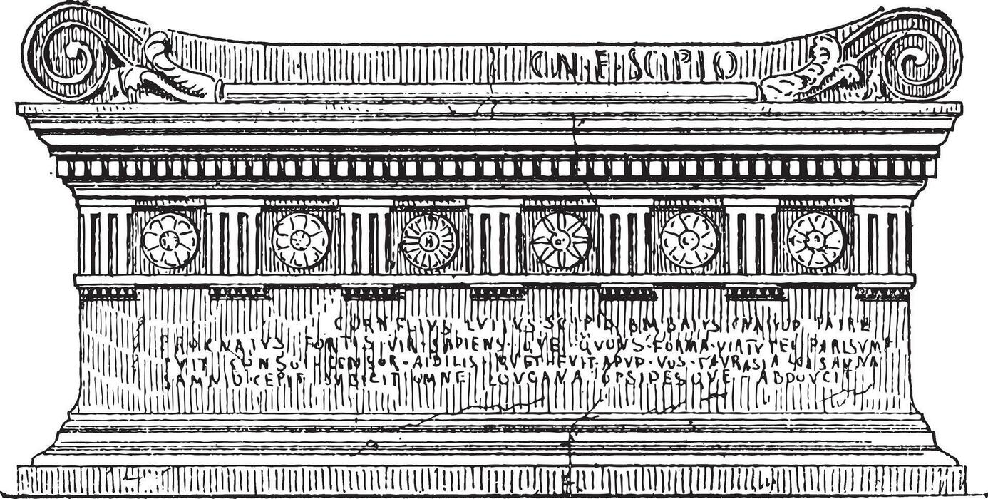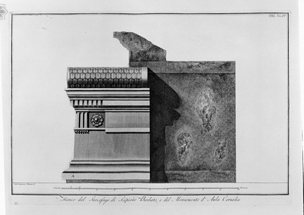 Alguns pesquisadores afirmam que o Antigo Egito é uma “criação moderna”. Meus caros amigos, quem então fez os sarcófagos de granito do Serapium, se nossa civilização, tão avançada, é agora incapaz de fazê-lo? Talvez os criadores dessas “criações modernas” tenham usado uma máquina do tempo e vindo do futuro… Mais tarde, os sarcófagos passaram a ser feitos de material composto. Claramente, uma perda tecnológica. Voltemos ao nosso sarcófago no Túmulo dos Cipiõeso. Ele é feito de uma única peça de tufo vulcânico, como consta na descrição abaixo da gravura… Aliás, o desenho de Piranesi retrata dois sarcófagos descobertos nesta mesma tumba.